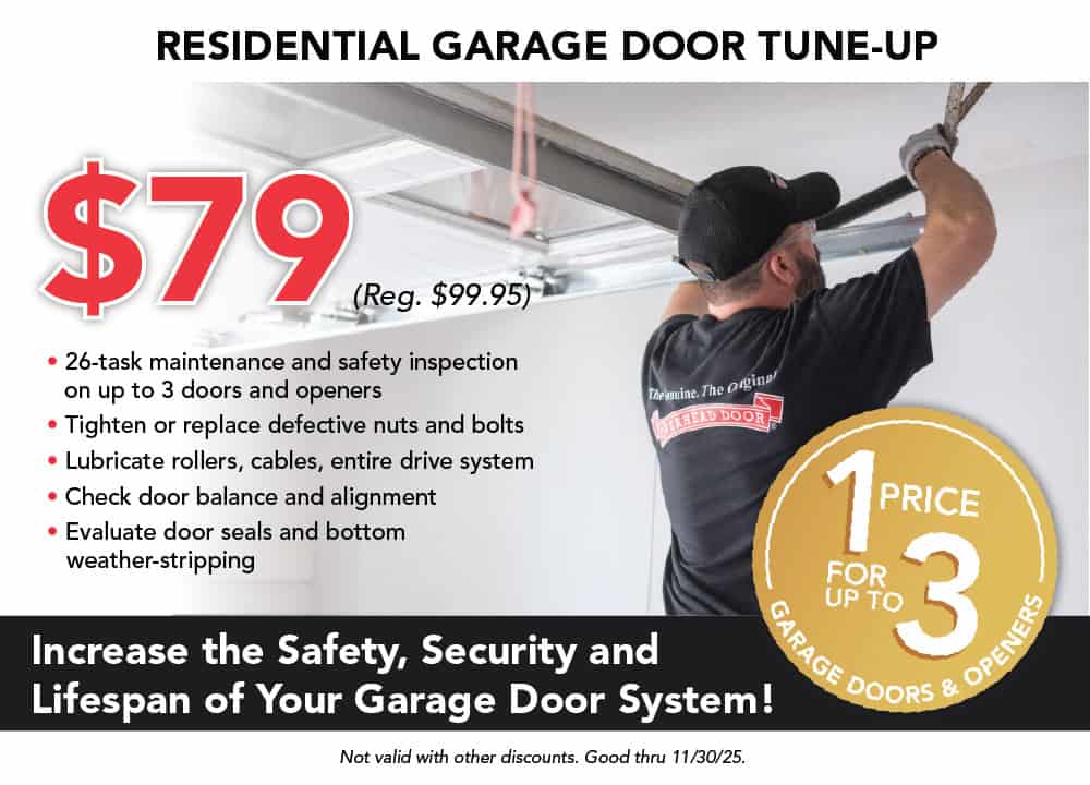 - Comprehensive safety inspections for up to three garage doors and garage door openers.